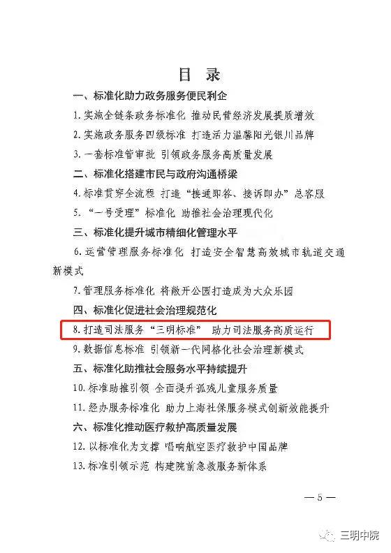 这批典型案例涵盖政务服务、城市管理、社会治理、司法服务、医疗救助等方面,为促进全国社会治理能力和公共服务水平提升发挥了示范带动作用。 2017年,三明市中级人民法院在省市场监管局的培育指导下,承担了全国司法服务的标准化试点任务。经过3年试点建设,首创便民利民的司法服务标准体系,共141项标准,建成标准化司法服务中心和24小时自助司法服务中心。通过标准化建设,中心工作效率提升,服务事项翻倍,全程网办事项占比30%以上,当日办结率80%,移动微法院应用率97%,网上办、一次办等事项占比达99%。“三明标准”在全国高级法院院长座谈会上作典型经验交流。