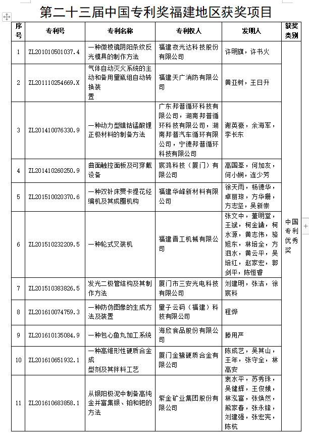 热烈祝贺 第二十三届中国专利奖 福建地区 获奖量取得“大丰收” 近日,国家知识产权局发布《关于第二十三届中国专利奖授奖的决定》,对为技术(设计)创新和经济社会发展做出突出贡献的专利权人和发明人(设计人)以及相关组织者给予表彰。福建夜光达科技股份有限公司“一种微棱镜阴阳条纹反光模具的制作方法”等26个项目获中国专利优秀奖,金牌厨柜家居科技股份有限公司“厨柜(亚丁3)”等4个项目获中国外观设计优秀奖。 本次获奖项目总数达30项 (含2项与省外专利权人共有) 位居全国第7位 是历年来获奖项目最多的一届 中国专利奖由中国国家知识产权局和世界知识产权组织(WIPO)共同评选,是我国唯一的专门对授予专利权的发明创造给予奖励的国家级政府部门奖,也是我国专利领域的最高奖项。 下阶段,省市场监管局将深入贯彻《知识产权强国建设纲要(2021-2035年)》,按照省委“提高效率、提升效能、提增效益”行动部署要求,进一步打通知识产权创造、运用、保护、管理和服务全链条,不断提升全省专利创造的积极性、主动性,在更高起点推动知识产权事业取得新的更大突破。