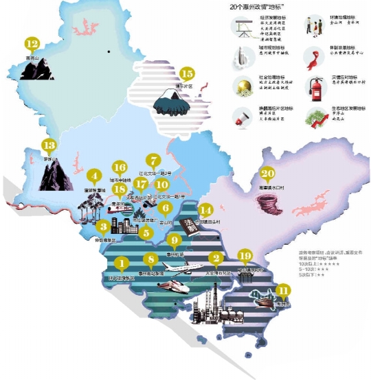1月2日,2014年第一个工作日,惠州市委书记陈奕威出现在惠东县白盆珠镇、宝口镇、高潭镇等受去年“8·16”洪灾影响的地方,检查全倒户灾后重建工程。 这一具体而微的日常工作安排,在地方官场可被赋予多重解读。在什么时间节点上,地方主政者去哪了,亦是政治地理学务必讲求的象征意义所在。 从这一角度回望2013年的惠州,你或会发现另一幅既熟悉又陌生的版图。这一年,纵横1.12万平方公里、总面积约占珠三角经济区四分之一的“大惠州”,有哪些地方频频被地方主政者乃至省部级官员光顾或触及,背后有怎样的政治考虑或治理方式,又会有哪些可以预见的后续影响? 经过对过去一年官员们政务活动的梳理,我们统计出最受官员们瞩目的20个惠州“地标”。这些“地标”,大至跨行政区划的环大亚湾新区,小至市信访局的一间接访室,近至一条已经得到环境治理的穿越市区的小河涌,远至尚处于概念构想阶段的潼湖智慧城,无一不是官员们在调研考察、会议讲话或重要文件中的“心头好”。 若再加细分,这20个惠州“地标”大约隶属于政务工作的8种类型,包括经济发展、城市规划、环境治理等,分别对应不同的执政重心。现在,一起打开地图,重温2013年的如烟政事。 1最具活力增长极 环大亚湾新区 ★★★★★ 范围包括惠阳区和大亚湾经济技术开发区的全境,以及惠东县境内324国道以南的8个镇,一共20个镇,陆地面积2168平方公里,海域面积4520平方公里。重要考核指标是,到2017年G D P达到2000亿元。 20 13年3月26日,市委常委会议确定全面启动惠州环大亚湾新区建设。这一新区的建设后被主政者认为是“惠州尽快进入珠三角第二梯队的希望所在”。 2世界级石化基地 大亚湾石化区 ★★★★★ 以2013年年初(2月19日)和年末(12月28日)省委书记胡春华的两次亲临调研为重要标志,大亚湾石化区在惠州版图上的地位无可取代。两次调研也奠定了省委、省政府大力支持中海油把惠州基地建设成为世界级的石化产业基地的基调。7月9日,中海油惠州炼化二期项目正式开工,总投资超过800亿元的项目“砸”进大亚湾石化区。 3“进二”重大支撑 仲恺高新区 ★★★★★ 和环大亚湾新区并列惠州“进二”的两大平台,目标是到2017年GDP达1000亿元。2013年2月19日,省委书记胡春华莅临调研,强调要加大对民营科技型企业的扶持。 作为惠州最年轻的县区,从工业园区到城市化的蝶变尚任重道远。7月10日,市委书记陈奕威要求仲恺重点抓好经济、城市、社会三个转型升级。 4千亿级战略平台 潼湖智慧城 ★★★★★ 选址在仲恺高新区西部,包括潼湖湿地在内的潼湖镇、潼侨镇、沥林镇和陈江街道沿湖周边部分用地,总面积约150平方公里。2013年属于概念构想阶段,被赋予“千亿级战略平台”等宏大词汇。7月18日,“加快‘潼湖智慧城’规划建设”写入《中共惠州市委、惠州市人民政府关于乘势而上加快发展尽快进入珠三角第二梯队的决定》,有媒体评价称“对于潼湖智慧城的框架描述,虽是惊鸿一瞥,但隐约已经可以闻得惊雷之声”。 5质疑中坚挺运营 市垃圾焚烧厂 ★★★★★ 位于市区下角共联村,2012年初45名市人大代表联名提交要求搬迁的建议。2013年4月投入2050万元升级改造。其间副市长邓庆忠频繁带队检查,强调要定期向社会公布项目进度。不过,改造竣工后并未平息民怨。11月19日,共联村20多名村民将私家车开到通往垃圾焚烧厂的唯一道路,将18辆垃圾转运车挡在了焚烧厂之外。12月5日,市环卫局透露,焚烧厂搬迁力争三年内完成。 6治水开篇 金山河 ★★★★★ 2012年市政府“十件民生实事”之首,是跨年度工程,也是天价整治工程,一公里约一亿元,总投资近10亿元。陈奕威2011年下半年莅惠后主抓的第一个民生工程,因此,2013年市“两会”代表、委员检阅金山河整治效果之前,他多次带队检查工程。其中,2013年5月1日,他在实地检查过程中表示,金山河整治为全市河涌整治开了一个好头。 |