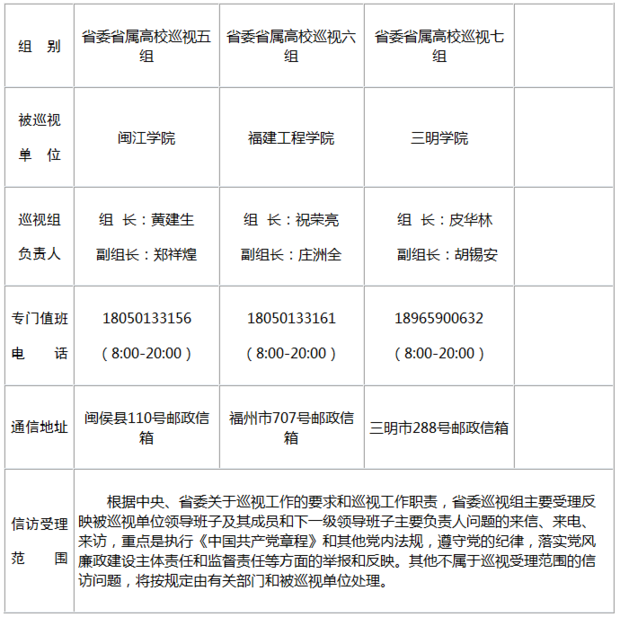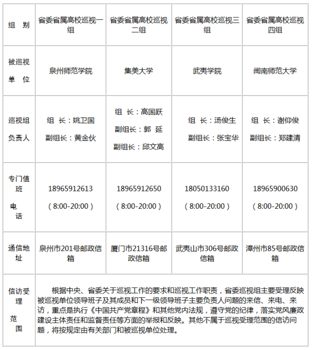 - [ 03-30]福建7个巡视组进驻省属高校巡视 联系方式公布